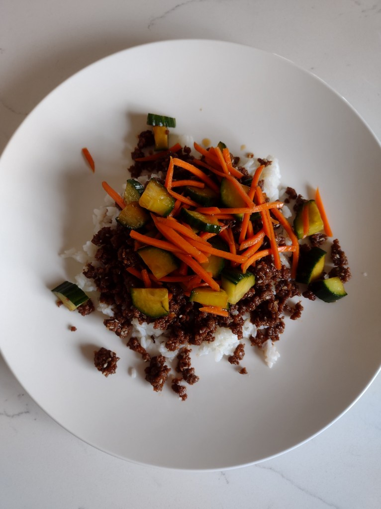 This dinner is delicious and it is made with rice, ground beef, and cucumbers and shredded carrots along with a bunch of seasonings and sauces that I won’t get into here.